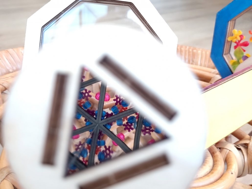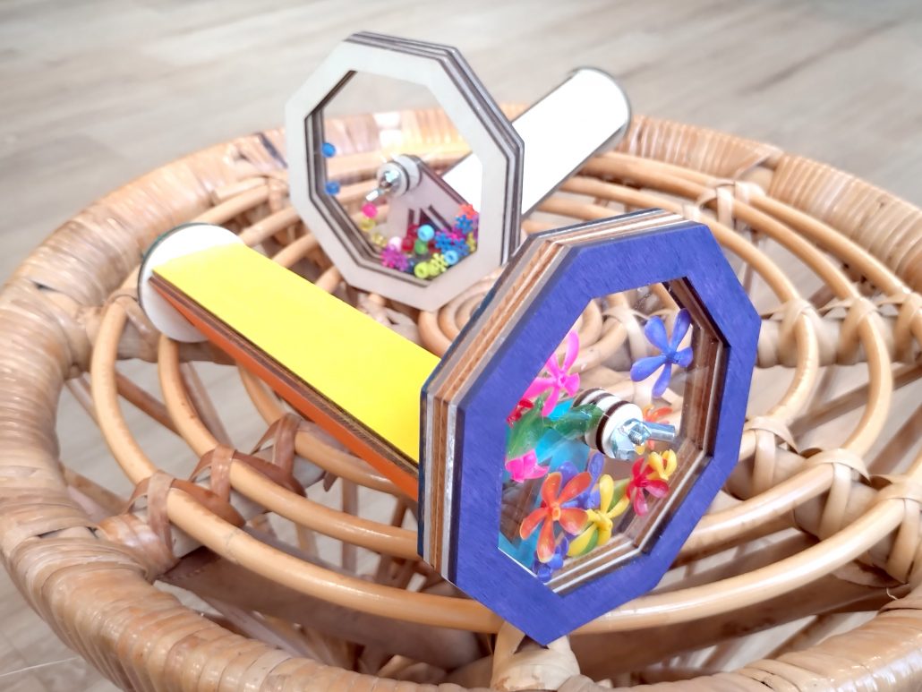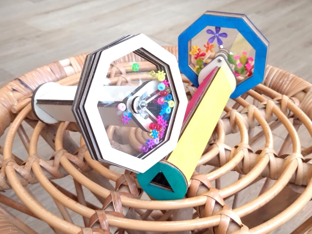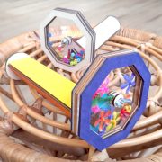 A 玩味木工拼接旋轉萬花筒一個 (約長18cm, 旋轉部份直徑約10cm)