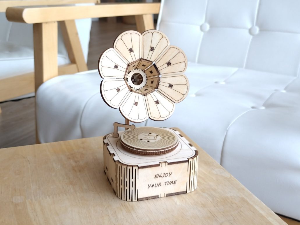 • 木質零件組裝過程:使用精準裁切的木片手工組裝留聲機主體,體驗木作工藝的細膩質感與結構拼接樂趣。